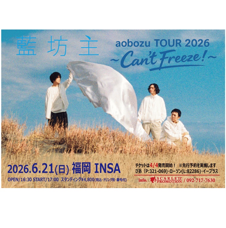 Schedule 2026/02/14(土) ミトくろーず 【ミトくろーず単独公演_8~凛々】※2026年最初の「すぐ来るぅ~」がすぐ来るぅ~! 2026/06/21(日) 藍坊主 aobozu TOUR 2026 ~Can't Freeze!~ 2026/05/08(金) CANDY DULFER (キャンディー・ダルファー) CANDYDULFER "FUNKALICIOUSTOUR" IN JAPAN 2026/05/02(土) T字路s MAGIC WANDERIN' DUO TOUR 2026 Eventその他イベント情報はこちらから Artist スカーレットプロモーションがお勧めする アーティストの最新情報はこちらから Read More Ticket スカーレットプロモーションで取扱う先行販売チケットや 九州・沖縄の選りすぐりチケット情報をご紹介しています Read More News NEWS 2025/12/14 SHOOT THE MOON 初のEP「before any... NEWS 2025/11/26 SHOOT THE MOON 外薗葉月についてのご報告 NEWS 2025/11/26 CANDYDULFER"FUNKALICIOUSTOUR"I... NEWS 2025/11/23 CANDYDULFER”FUNKALICIOUSTOUR”I... Read More Philosophy SCARLETT PROMOTION,LLC