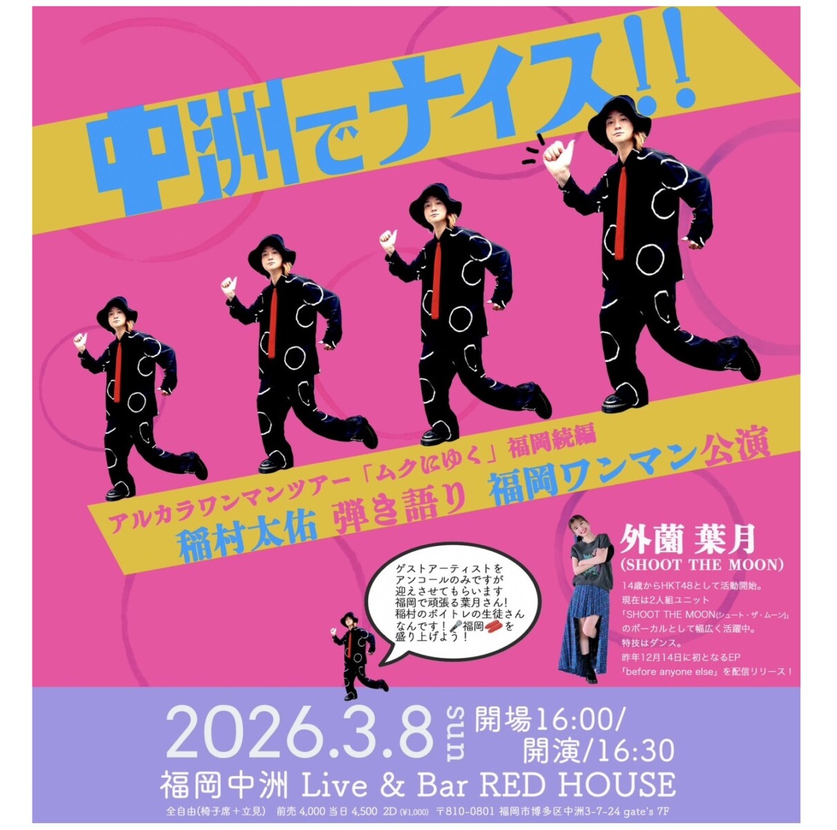 【福岡公演】稲村太佑 弾き語り 福岡ワンマン公演「中洲でナイス!!」 アルカラワンマンツアー「ムクにゆく」福岡続編開催日時 2026/03/08(日)